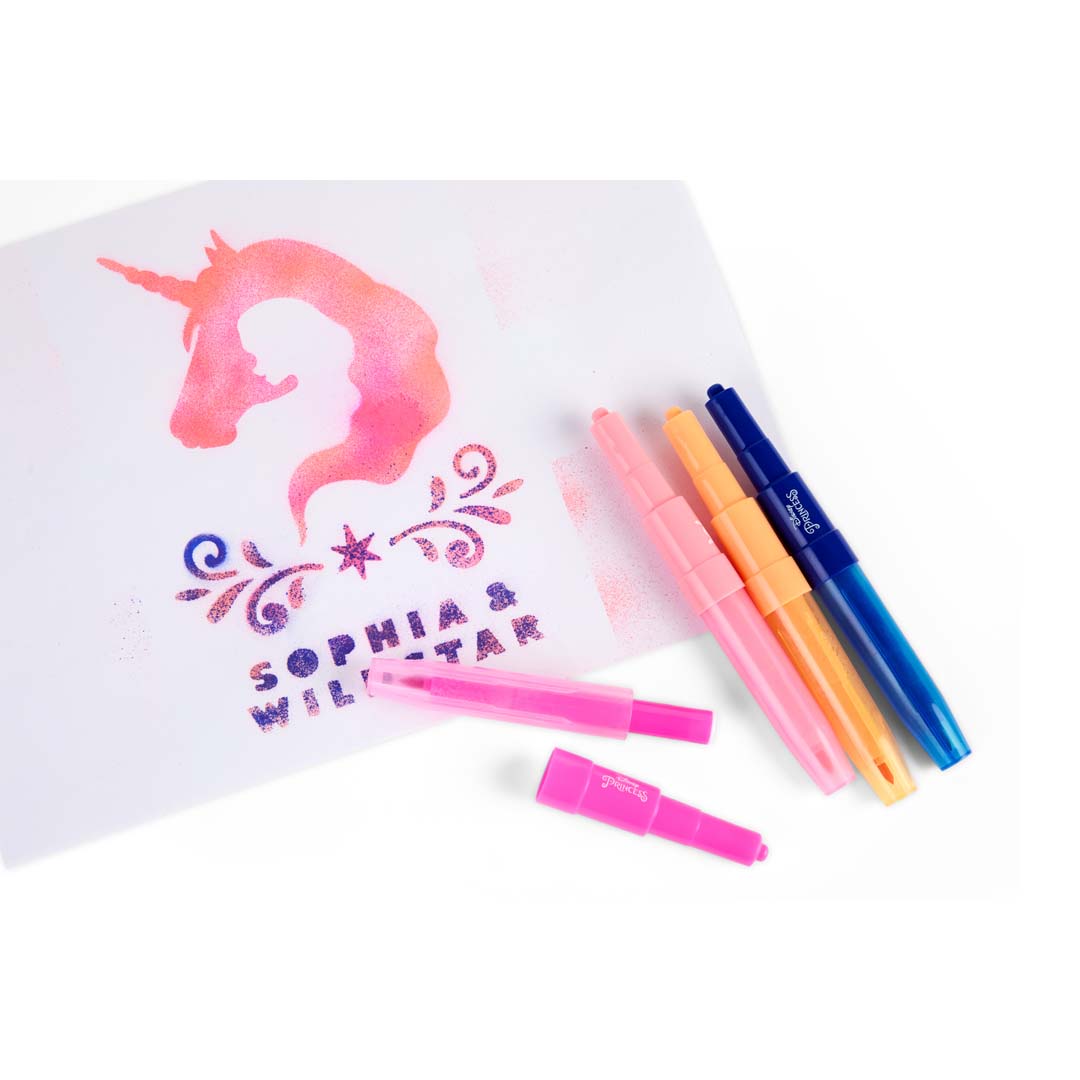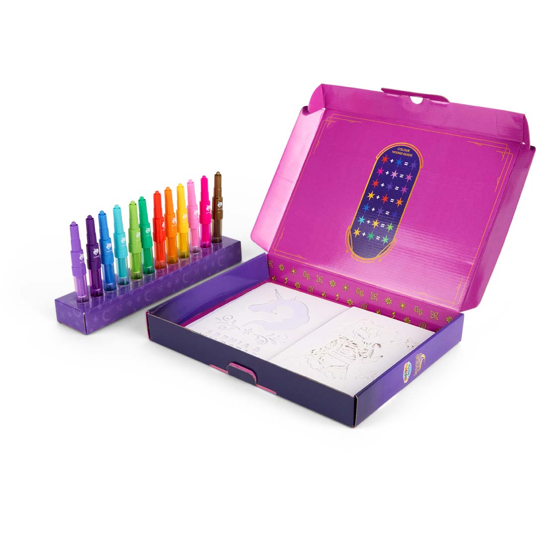 Die Unicorn Academy Sprühstifte-Box ist ein kreatives Bastelset für Kinder, das speziell für Fans der zauberhaften Einhorn-Abenteuer mit Sofia und Wildstar entwickelt wurde. Es enthält 12 Sprühstifte, 16 Schablonen (A4 + A5) mit Motiven aus der magischen Einhorn-Welt, 16 Blätter (A4 + A5) zum Bemalen sowie ein Tray für die Sprühstifte. Mit diesen Materialien können Kinder durch einfaches Pusten Farbe auf Papier auftragen und detaillierte sowie ansprechende Bilder gestalten. Die praktische Tischbox sorgt dafür, dass Kinder sauber und ohne Chaos arbeiten können. Das Set fördert die Kreativität und Feinmotorik von Kindern.