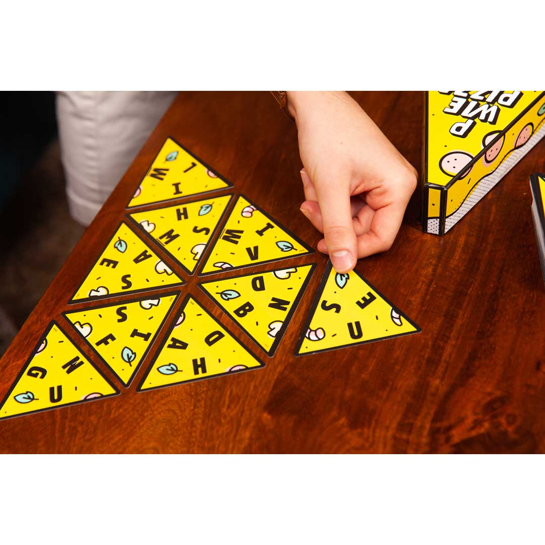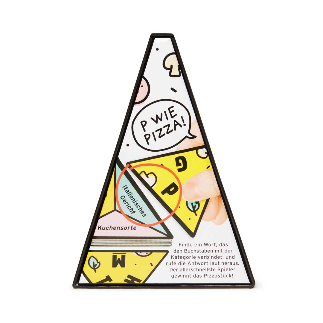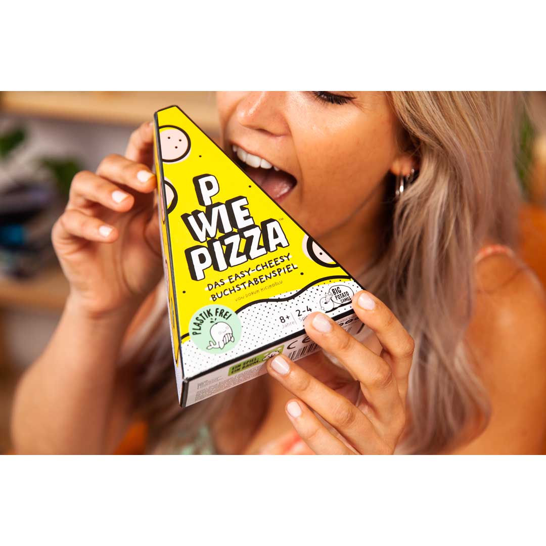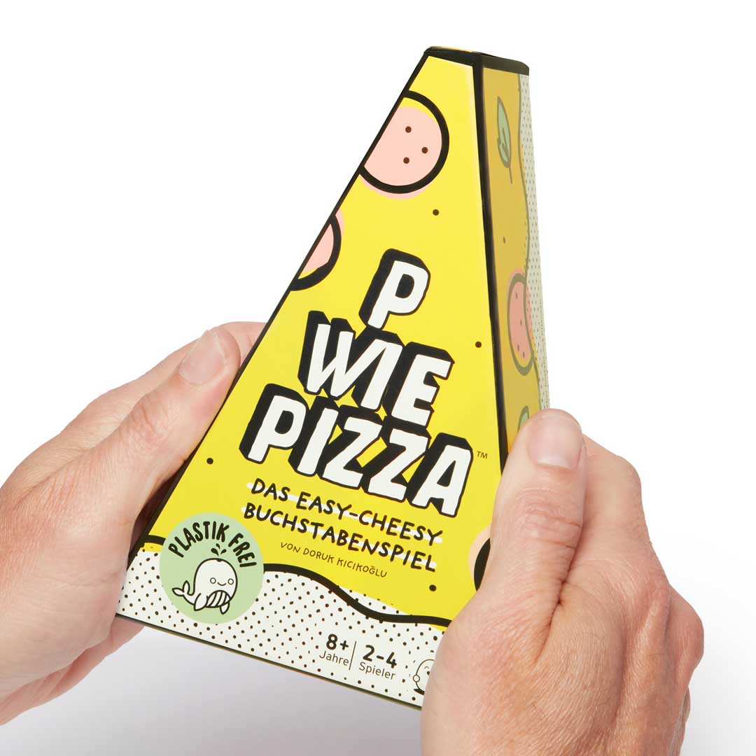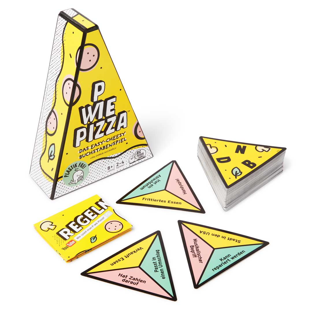 • Plastikfreier Buchstabenspaß - ein Lebensmittel, das mit P beginnt? In diesem Reisespiel, wird der erste Spieler, der neun Pizzakarten sammelt und sein riesiges Pizzastück baut - gewinnen!