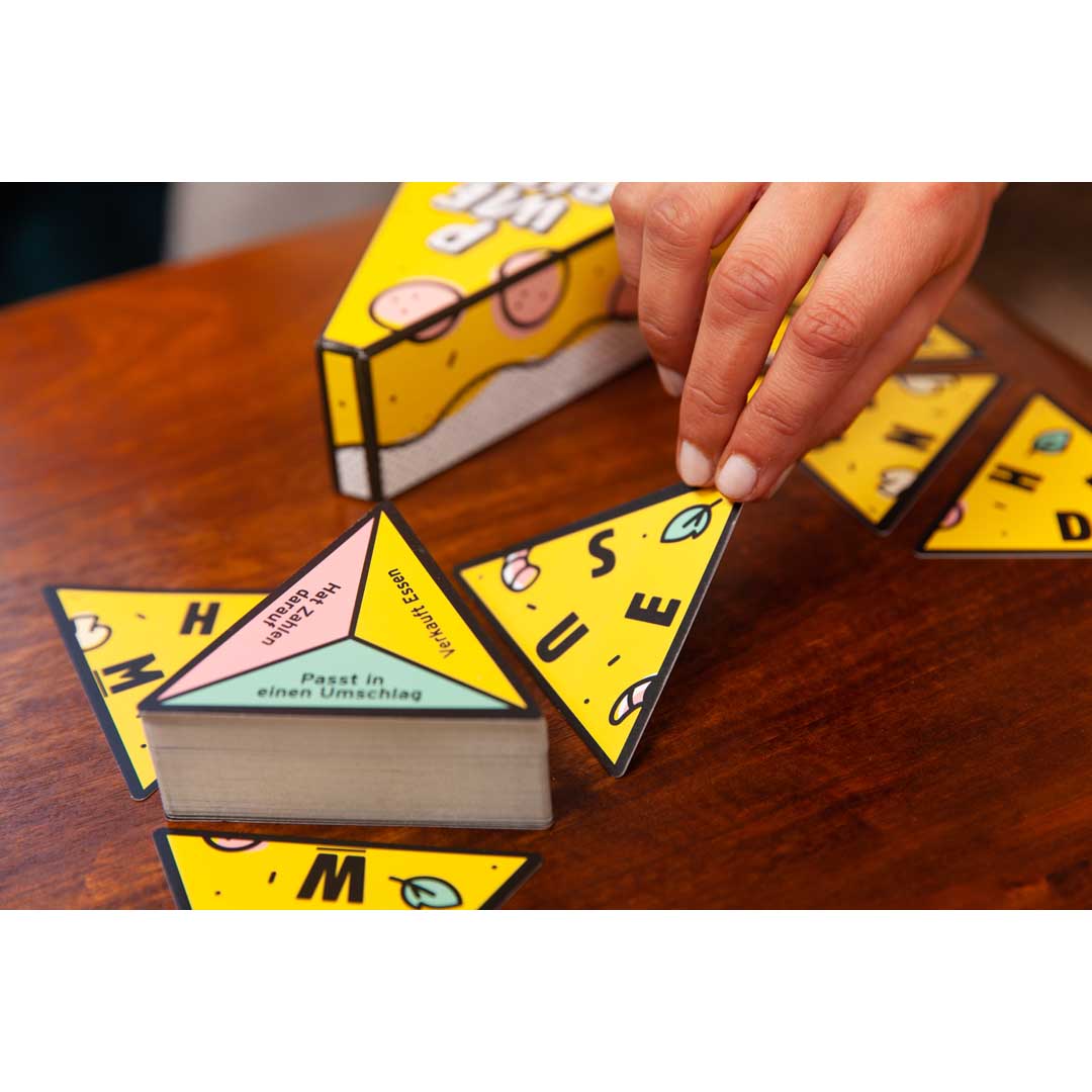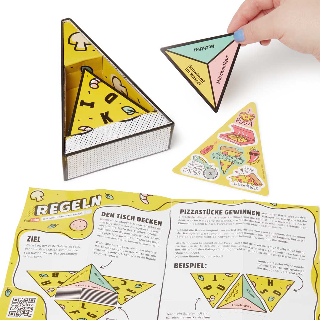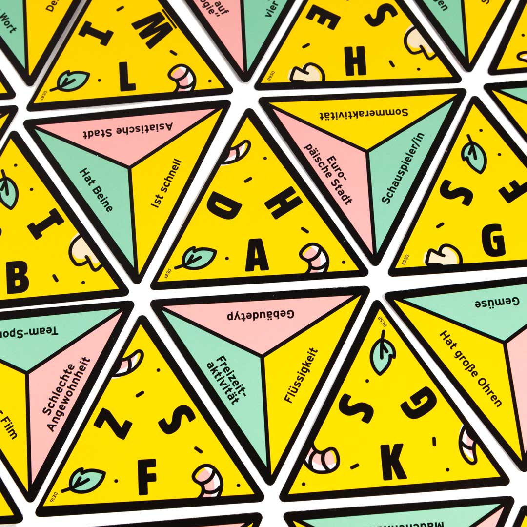• Ein rasant knackiges Wortspiel - es ist Takeaway-Zeit! Baue deine Pizza indem du ein Wort rufst, dass den Buchstaben auf der Karte mit der gegenüberliegenden Kategorie verbindet.