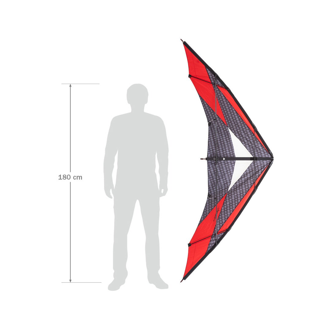 Der Arrow L ist eine äußerst dynamische Rennsemmel, die in unglaublicher Weise Kraft und Geschwindigkeit zu einem herausfordernden Flugerlebnis verbindet. Atemberaubend enge Loops um die Flügelspitze und eine schon im unteren Windbereich hohe Fluggeschwindigkeit lassen früh Spaß aufkommen. Der Arrow zeigt ein gutmütiges Startverhalten und lässt sich auch von Böen kaum aus der Ruhe bringen - Eigenschaften die für Lenkdrachen dieser Klasse eigentlich völlig untypisch sind. Im mittleren bis oberen Windbereich müssen Piloten bereit sein, sich der Herausforderung zu stellen und werden dann reichlich belohnt. Das optisch sehr ansprechende Carbon-Design und vor allem seine gestreckte, sichelförmige Gestalt geben dem Arrow ein echtes Alleinstellungsmerkmal in seiner Klasse.