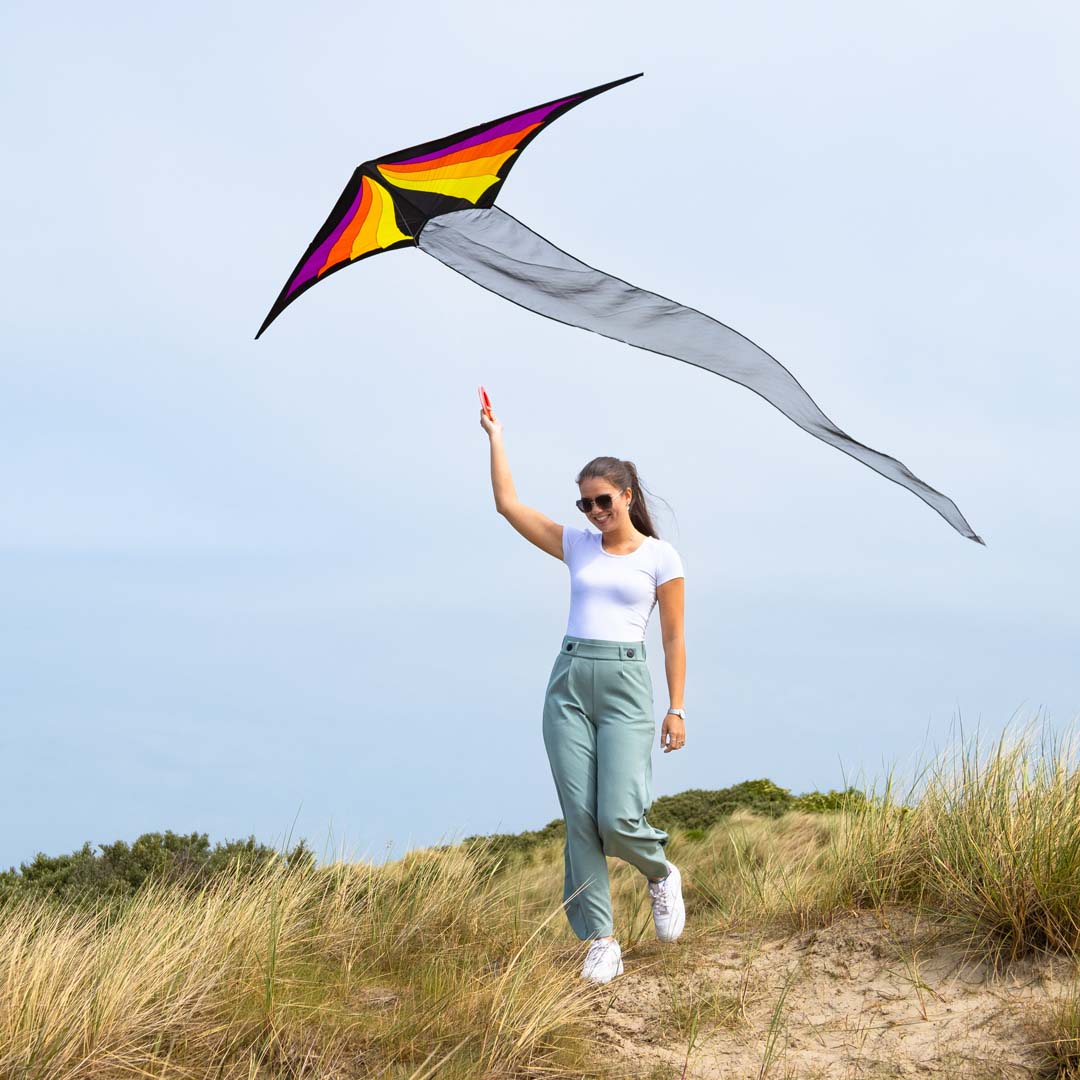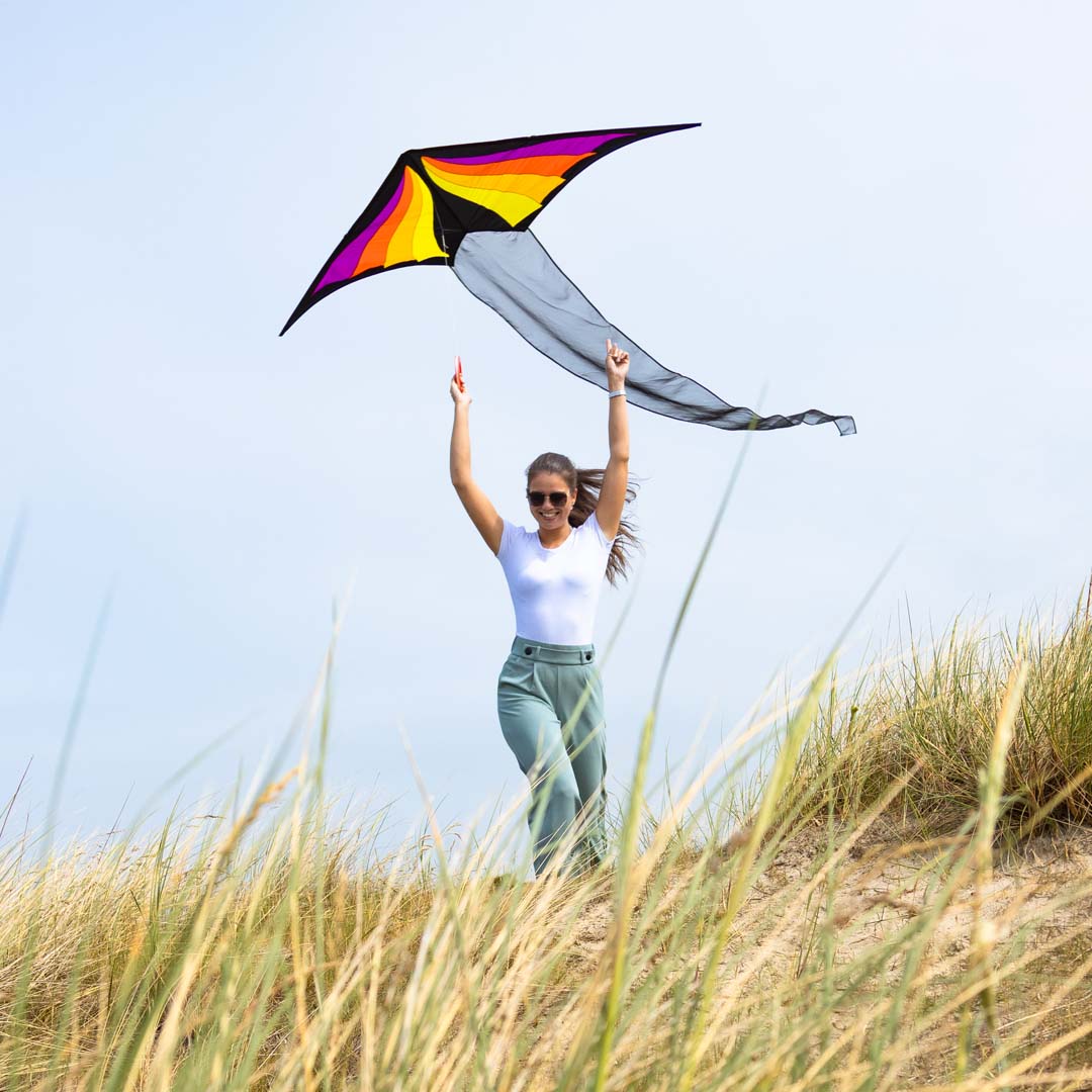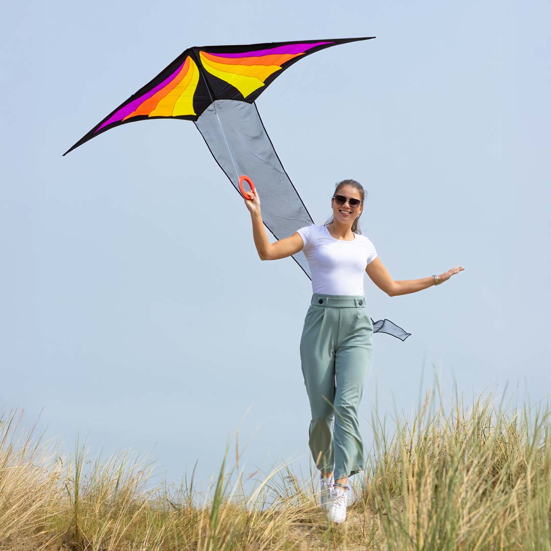 500 cm langen Organza-Schwanz bietet er ein beeindruckendes Flugerlebnis. Das charakteristische Farbspiel sorgt für einen faszinierenden Anblick am Himmel. Leichte, strapazierfähige Materialien und elegante Linienführung verleihen Stabilität und Leichtigkeit, was ihn zum idealen Flugpartner bei unterschiedlichsten Windverhältnissen macht. Ob am Strand oder im Park – dieser Drachen zieht alle Blicke auf sich und überzeugt durch seine Eleganz.