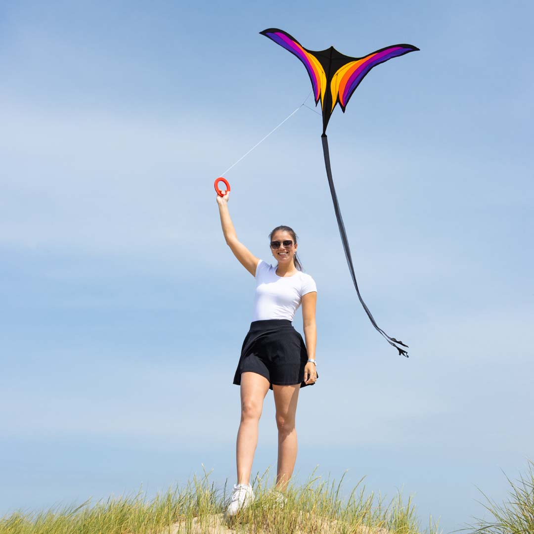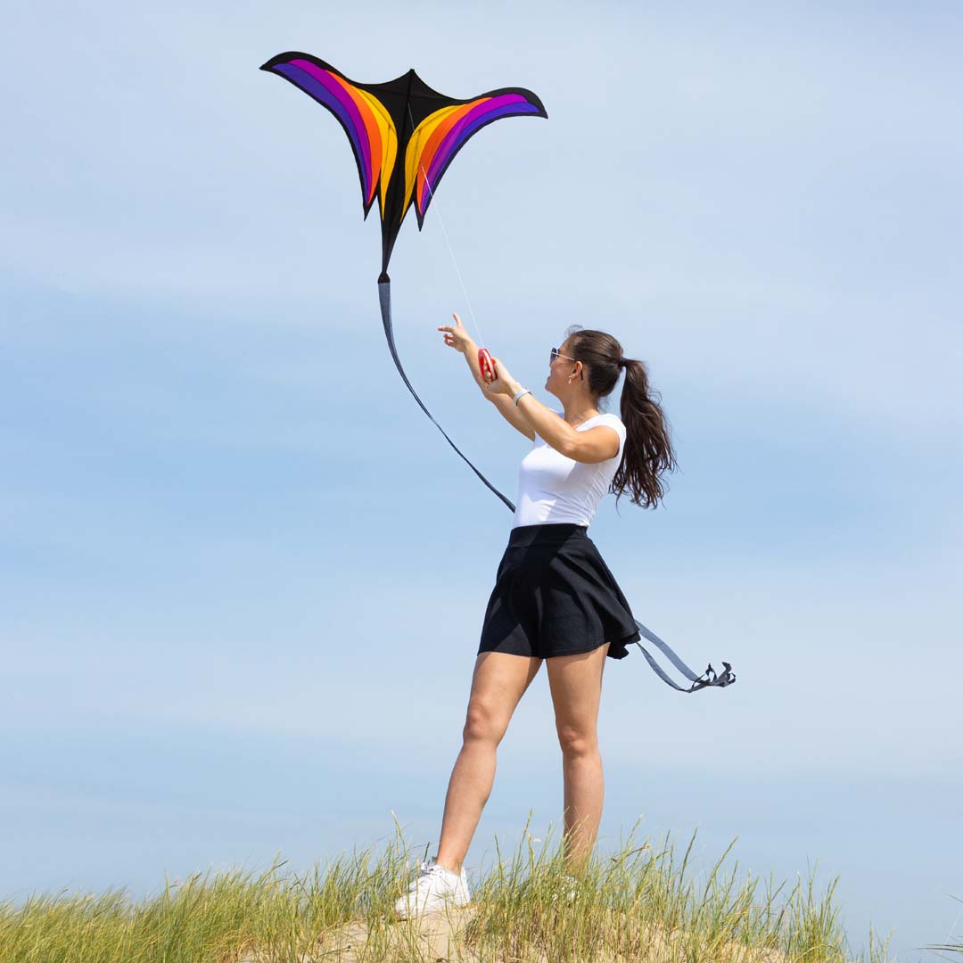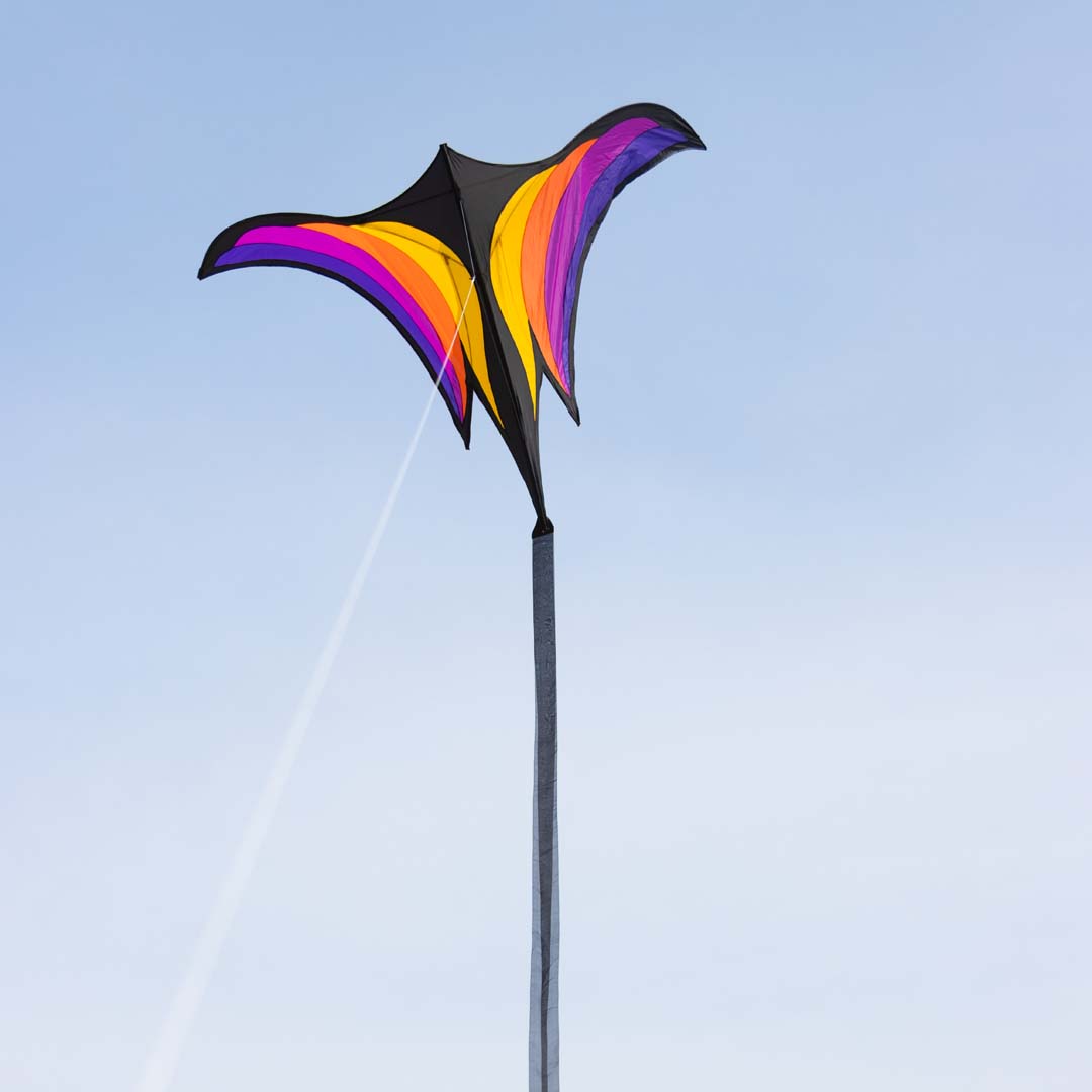 Der Ravenswing, exklusiv von Robert Brasington für Invento entworfen, vereint elegantes Design mit außergewöhnlicher Flugperformance. Mit einer Spannweite von 178 cm und einem 350 cm langen Organza-Schwanz bietet er ein einzigartiges Flugerlebnis. Hergestellt aus hochwertigen Materialien, strahlt dieser Einleiner-Drachen Eleganz aus und schafft mit seinem markanten Design und dem fließenden Schwanz eine faszinierende Optik. Der Drachen hat ein stabiles Flugverhalten und ist ideal für unterschiedlichste Windbedingungen. Der Ravenswing ist ein Kunstwerk, das den Himmel in ein farbenfrohes Spektakel verwandelt.