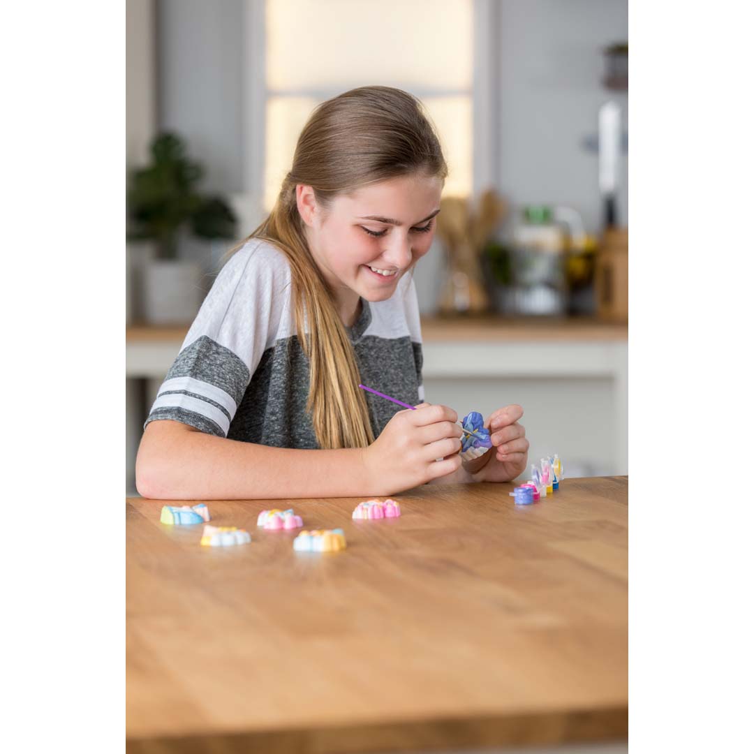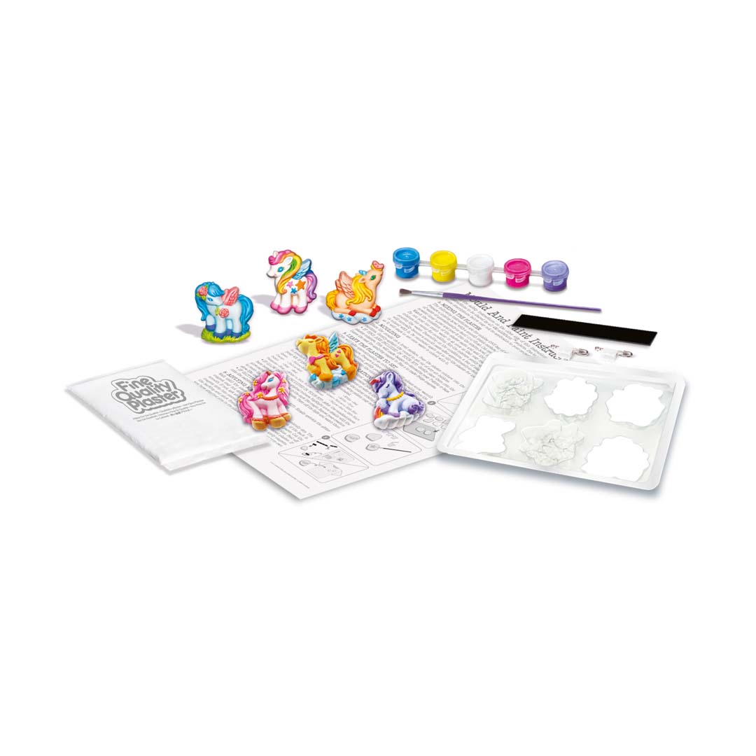 Inhalt: Gips, 6 Magnete, Farben, Pinsel, Glitzer, Anleitung.