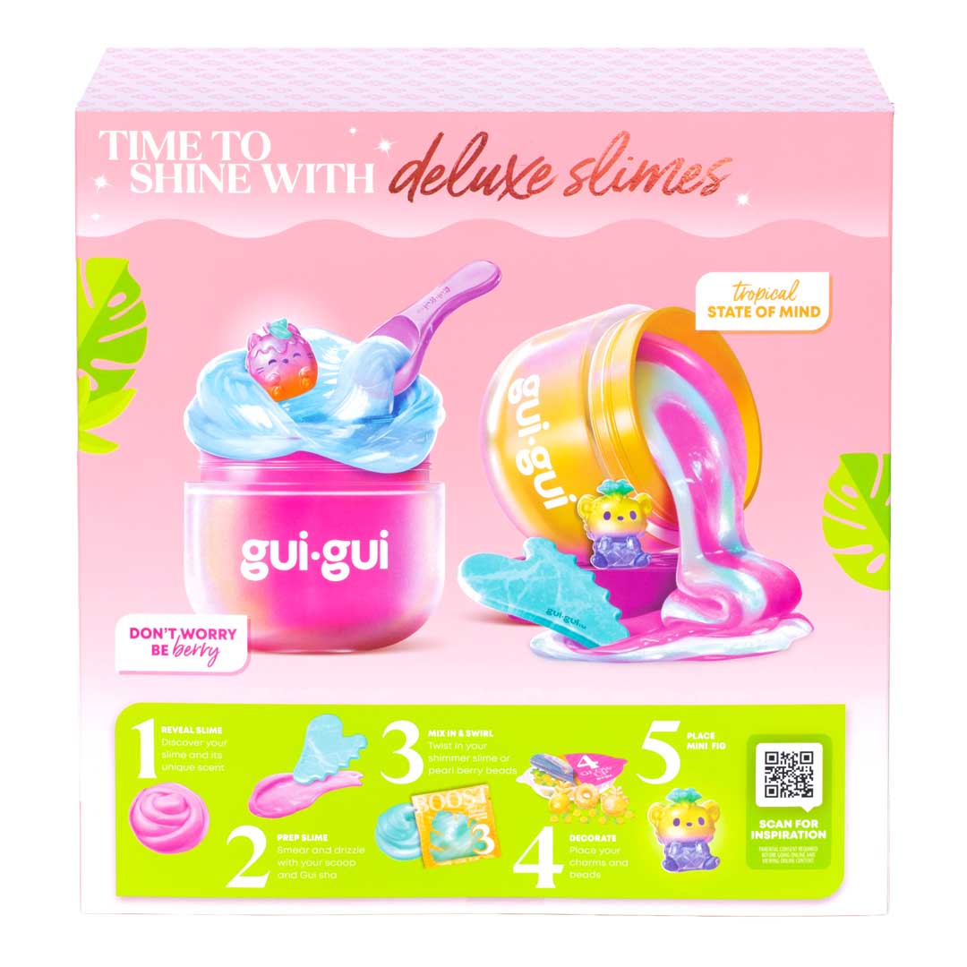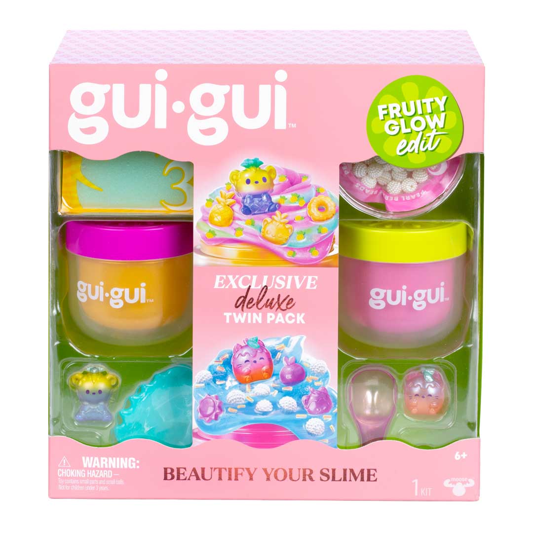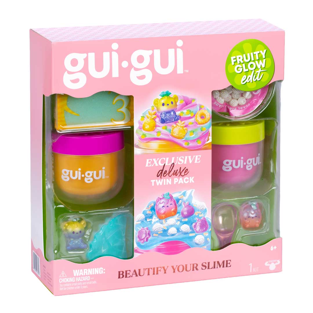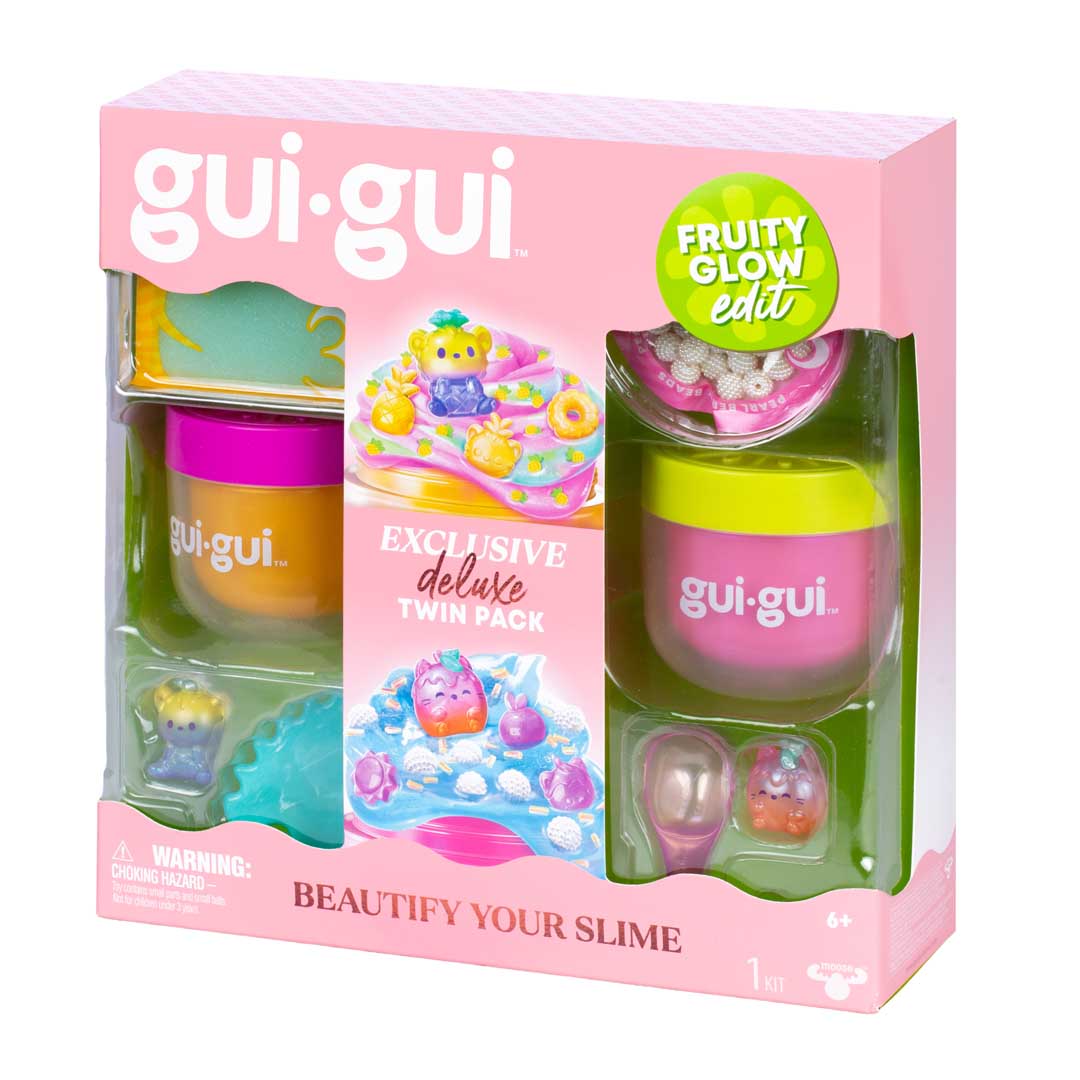 - Mit dem exklusiven Gui Gui Deluxe-Twin Pack glänzt dein verzierter Schleim gleich doppelt. Wenn du es öffnest, entdeckst du alles, was du brauchst. Befolge die 5 einfachen Schritte kreiere 2 exklusive Slimes und überzeuge alle mit deinen duftenden Schleim-Styles.