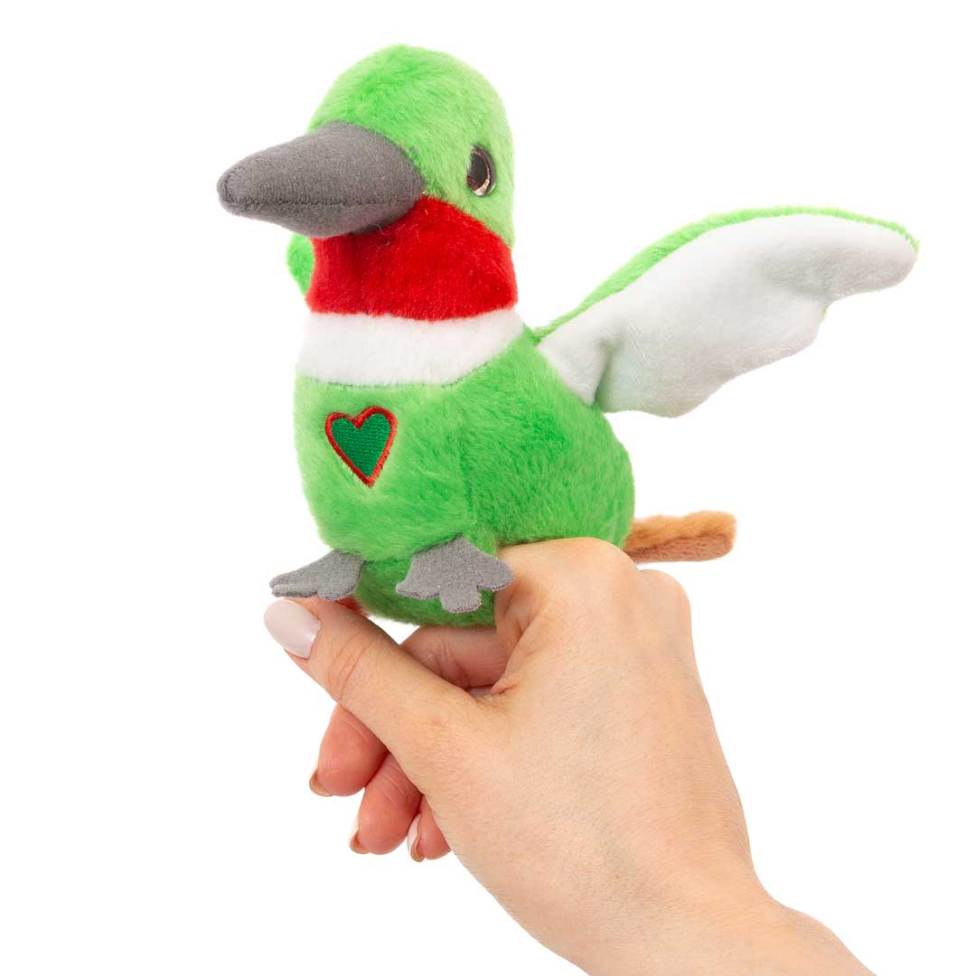 - Schlafmodus: Wird Happy Yappers eine Zeit lang nicht genutzt, wechselt der Vogel automatisch in den Ruhemodus. Einfach den Herz-Knopf drücken, um ihn wieder zu aktivieren