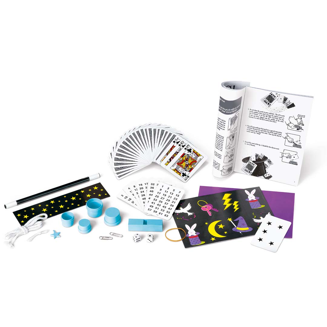 Tritt ins Rampenlicht und werde zum Zauberkünstler! Mit diesem spannenden Set lernst du 12 klassische Tricks, die leicht zu erlernen und beeindruckend vorzuführen sind – perfekt, um Freunde und Familie zu verblüffen. Dieses Zauber-Set fördert Selbstvertrauen, Geschicklichkeit und Präsentationsfähigkeit, während Kinder spielerisch die Welt der Magie entdecken. Ein ideales Set für kleine Magier mit eigener Zaubershow!