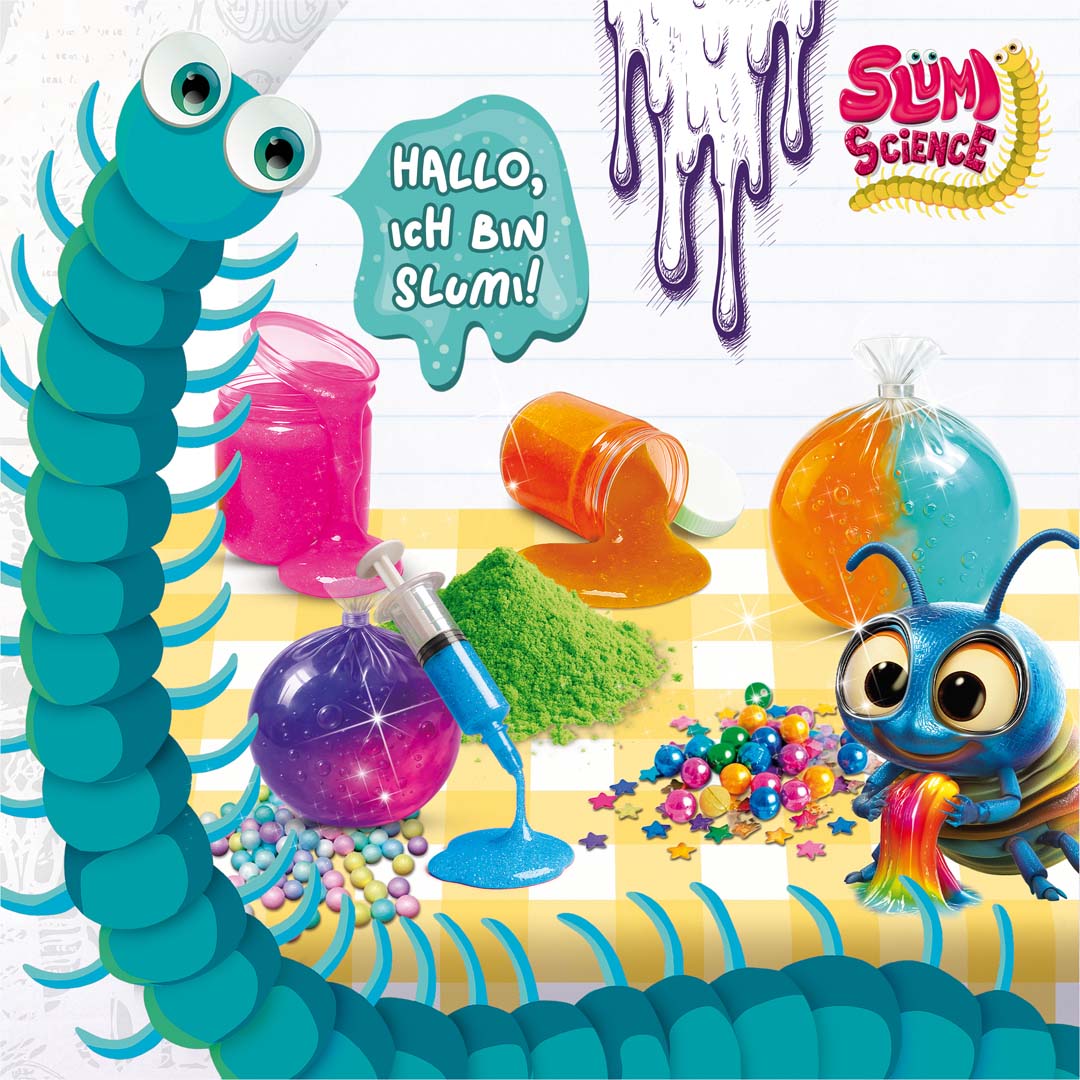Unser Slumi, der elastische Tausendfüßer mit einer Leidenschaft für Wissenschaft, präsentiert eine neue Spielzeuglinie, mit der Kinder Wissenschaft auf innovative Weise entdecken können – durch Quetschen und Kneten!