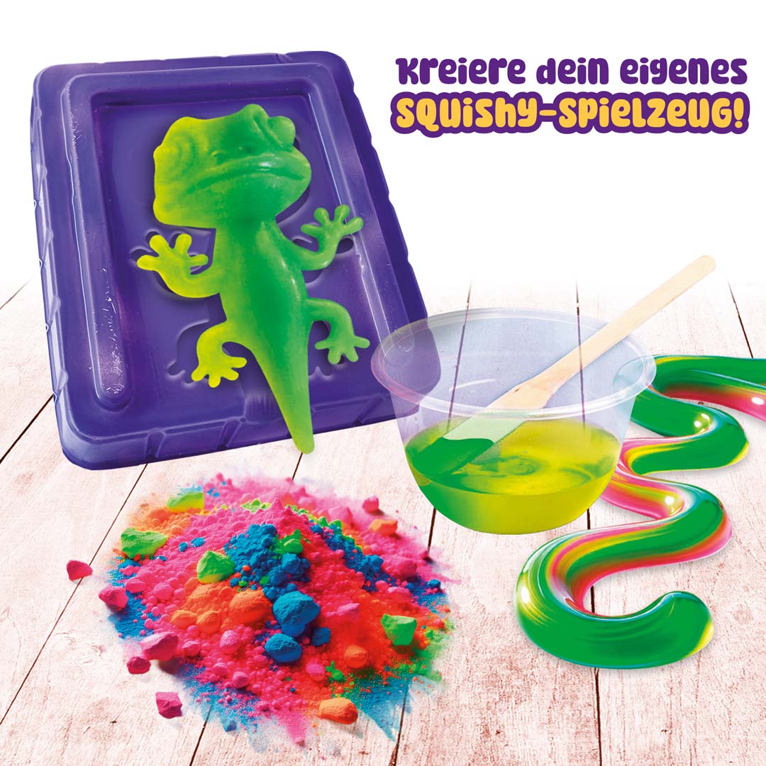 Erstelle mit diesem Set ein superweiches, elastisches Chamäleon. Mische die magischen Flüssigkeiten, füge die metallische Farbe hinzu, gieße die Mischung in die Form und warte kurz auf die Transformation - im Handumdrehen ist dein neuer Squishy-Freund fertig! Temperaturabhängig ändert er seine Farbe.
