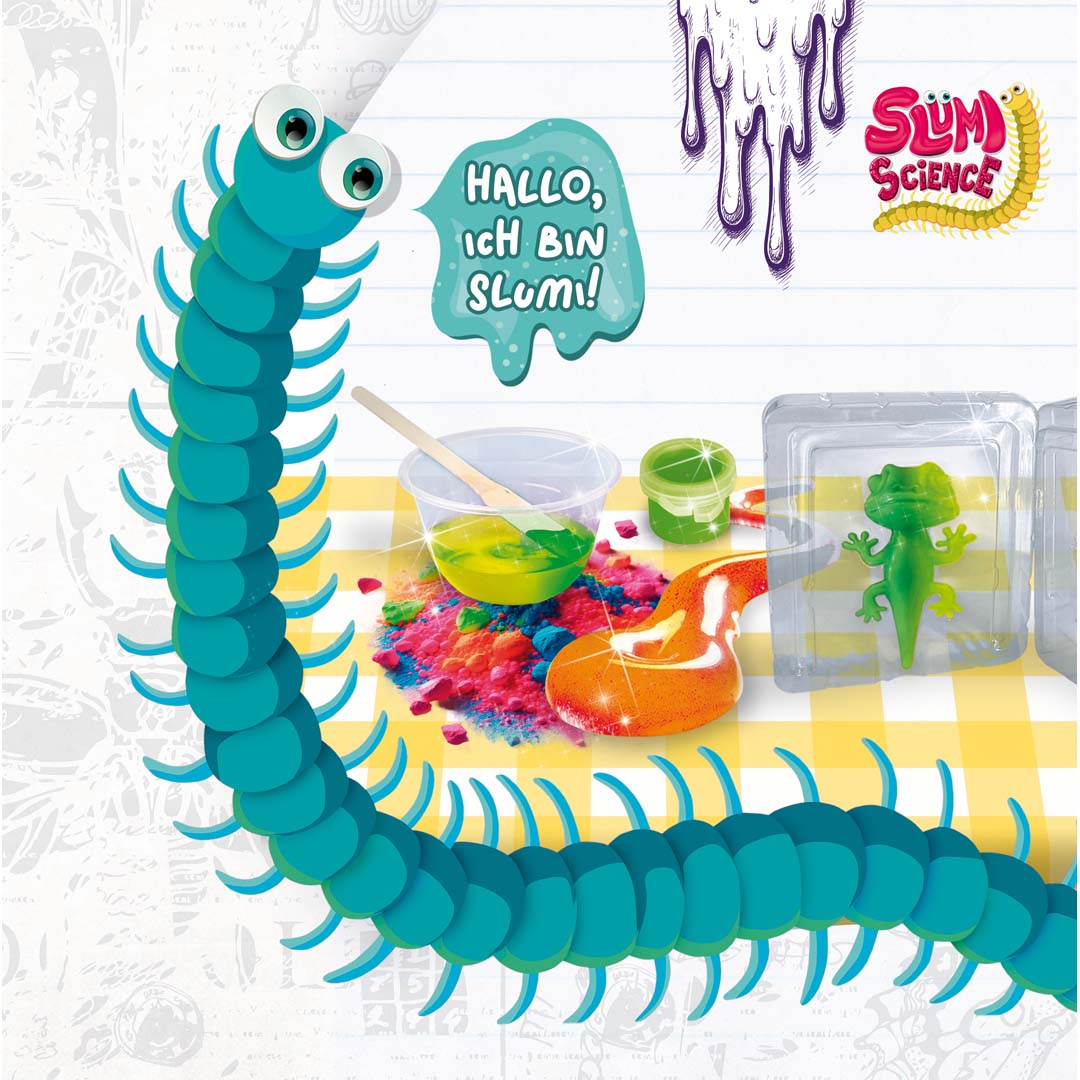 Unser Slumi, der elastische Tausendfüßer mit einer Leidenschaft für Wissenschaft, präsentiert eine neue Spielzeuglinie, mit der Kinder Wissenschaft auf innovative Weise entdecken können – durch Quetschen und Kneten!