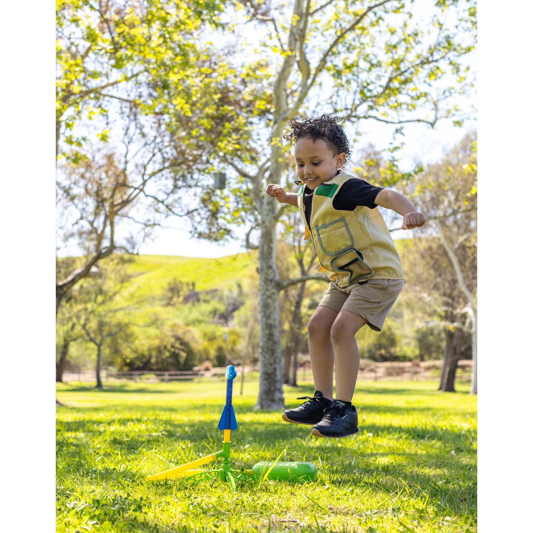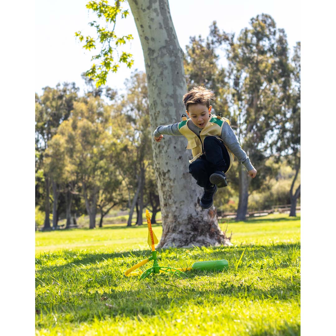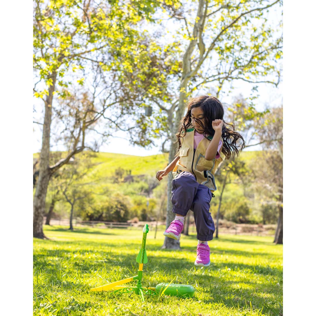 Mit der Dino-Soar Stomp Rocket startet eine Raketen-Show für kleine Entdecker! Einfach auf das Startkissen treten und die dino-inspirierten Raketen „Riley der Raptor“, „Trixie der Triceratops“ und „Theo der T-Rex“ heben ab. Die einstellbare Abschussrampe erlaubt Experimente mit Startwinkel, Kraft und Flugbahn. Natürlicher Antrieb mit Druckluft – keine Brennstoffe und keine Batterien erforderlich. Für Action im Freien: Perfekt für Garten, Park oder sonstige freie Flächen – fördert Bewegung, reduziert Bildschirmzeiten.