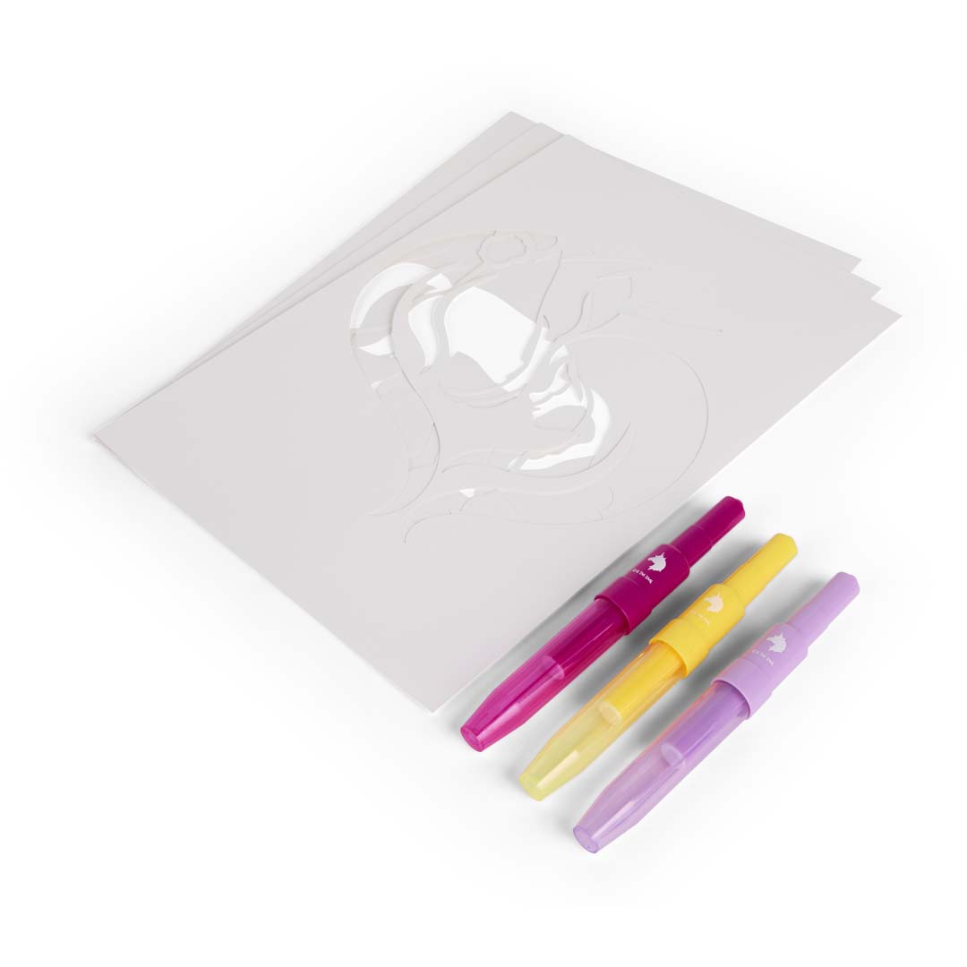 Mit dem Sprühstifte-Set A4 der Unicorn Academy wird jedes Kind zum Künstler seiner eigenen Einhornwelt. Kinder können eine der drei leuchtenden Farben wählen und ihre ganz eigenen Einhorn-Abenteuer sprayen! Durch das Pusten in die Stifte und die Nutzung der enthaltenen drei Schablonen entsteht eine magische Farbwirkung direkt auf dem Papier. Die Farben können kombiniert werden, um neue Farbtöne zu kreieren. Das Set fördert die Kreativität und Feinmotorik von Kindern.