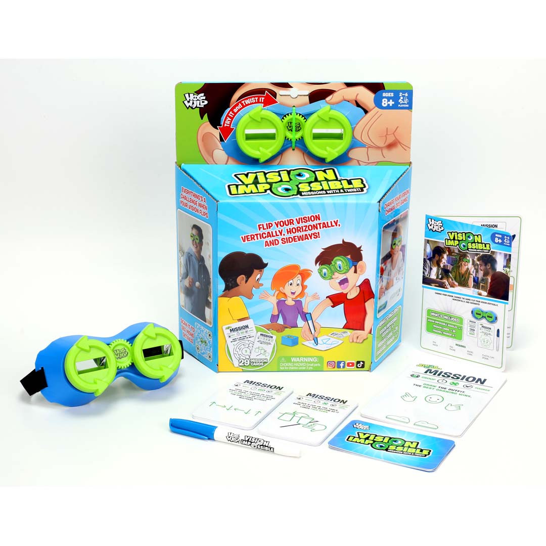 Contents: 1 x Vision Impossible Glasses (with adjustable lenses: up/down or sideways), 29 x mission cards, 1 x erasable marker, 1 x instruction manual. Players: 2–6.